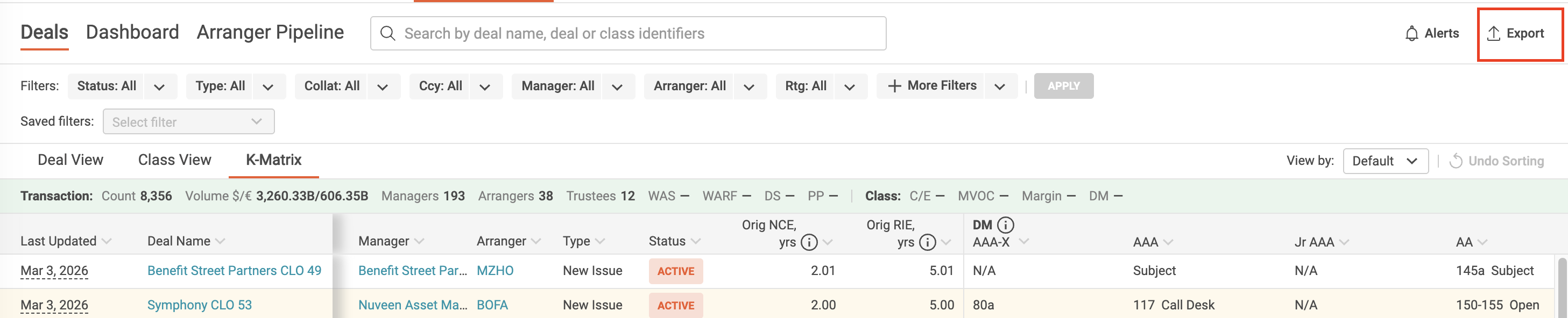 K-Matrix can now be exported directly from the Issuance Monitor. Click the “Export” button in the top-right corner to download the current view. Exports are limited to 1,500 transactions per file and include Active and Priced deals only.