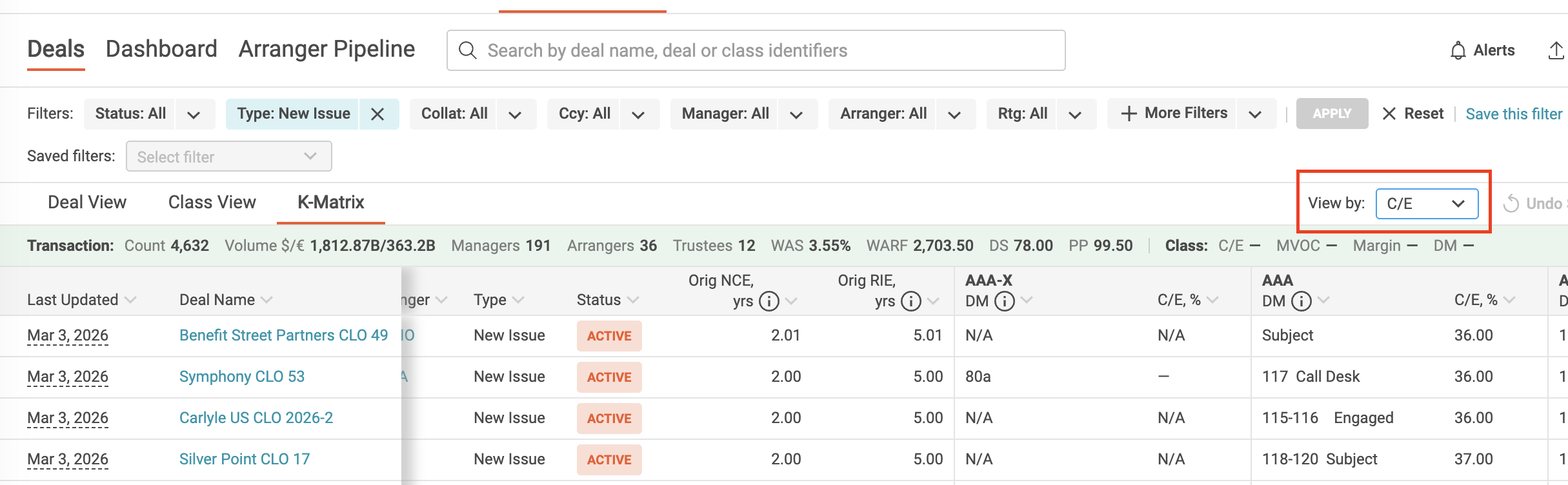 We've streamlined how you navigate within the Issuance Monitor for a more intuitive experience. The previous 'Deal View ⇄ Class View' switcher has been replaced with dedicated tabs for each view: Deal, Class, and the newly introduced K-Matrix. Now, it's even easier to find the layout that best suits your analysis. Simply apply your preferred filters and seamlessly switch between the Deal, Class, or K-Matrix tabs to explore the data in your desired format.
