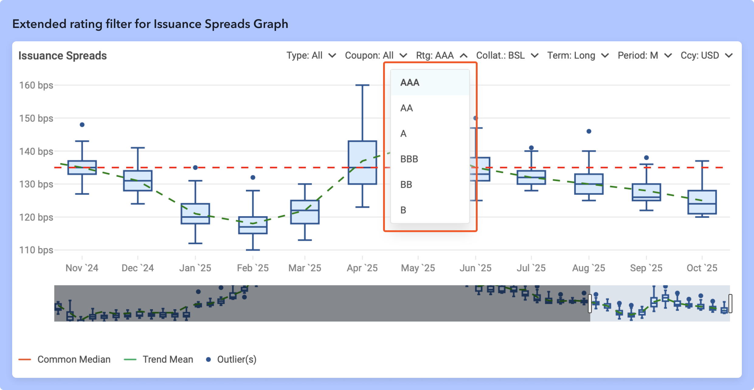 Single B rating option has been added to the rating dropdown on the Issuance Spreads page, allowing users to filter and view data for B-rated tranches.