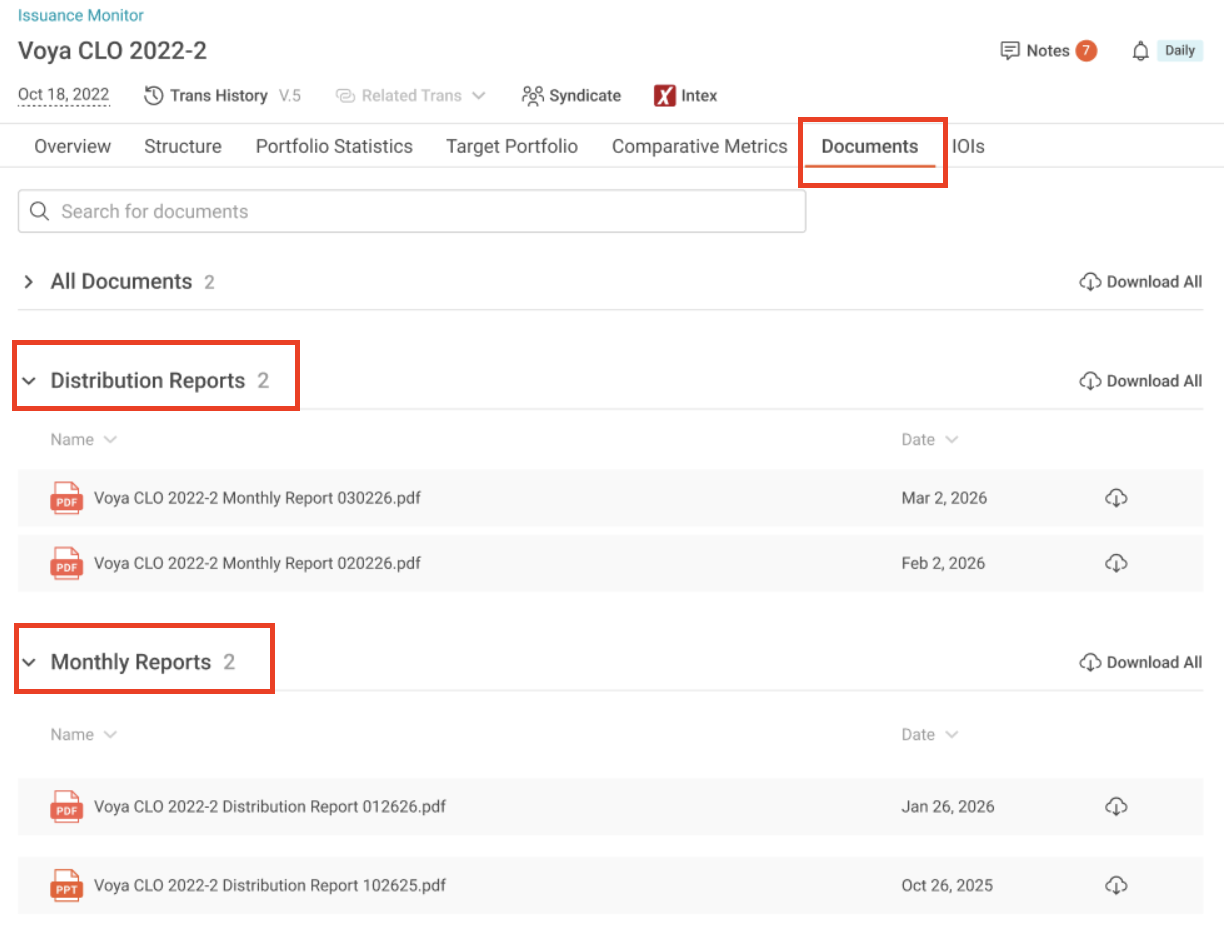 We’re excited to announce the launch of our new Deal Documents feature, providing a centralized hub for all your CLO deal documentation needs. Whether you’re bidding on a BWIC or managing your portfolio holdings, you now have seamless access to critical documents like Offering Memorandums, Indentures, Quarterly Payment Reports, and Monthly Collateral Reports—all in one place. With just one click, you can download entire sets of documents or hand-pick the ones you need. Stay ahead of the game with 70% of CLOs already covered and full coverage planned within the next 6 months. Access documents easily via the document icon in the ‘Docs’ column on the BWIC Monitor, Dealer Inventory, Portfolio, or CLO Manager Profile tabs. Now, you’ll be fully prepared for every BWIC trading session—CLO investing has never been easier!