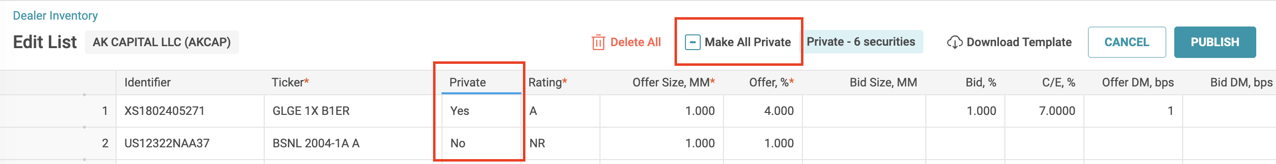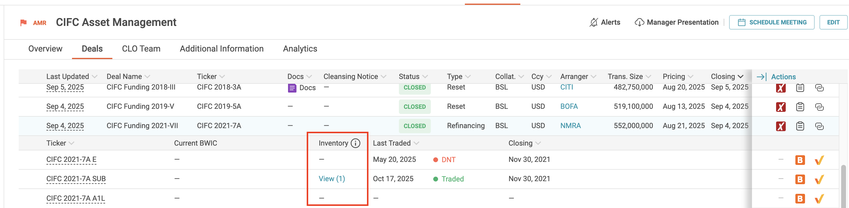 This feature gives managers direct visibility into how their tranches are circulating in the secondary market. In addition to BWIC notifications, the Deals tab now includes dealer inventory, providing a more complete picture of current availability. The use case is transparency and market awareness. Managers can see which parts of their capital structure are actively held by dealers, where liquidity is building, and how their deals are trading beyond formal BWIC processes. This helps inform engagement with the street and supports discussions with investors.